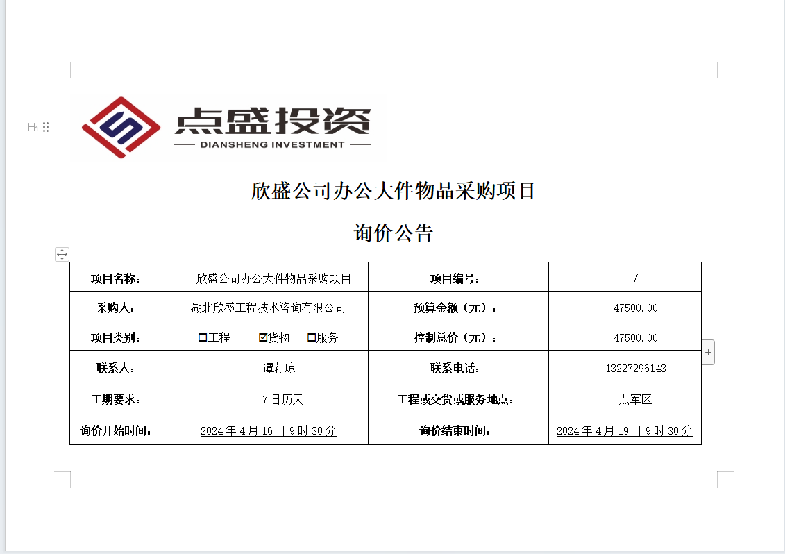 欣盛公司辦公大件物品采購項(xiàng)目詢價公告