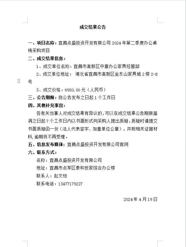 宜昌點(diǎn)盛投資開發(fā)有限公司2024年第二季度辦公桌椅采購(gòu)項(xiàng)目成交公告