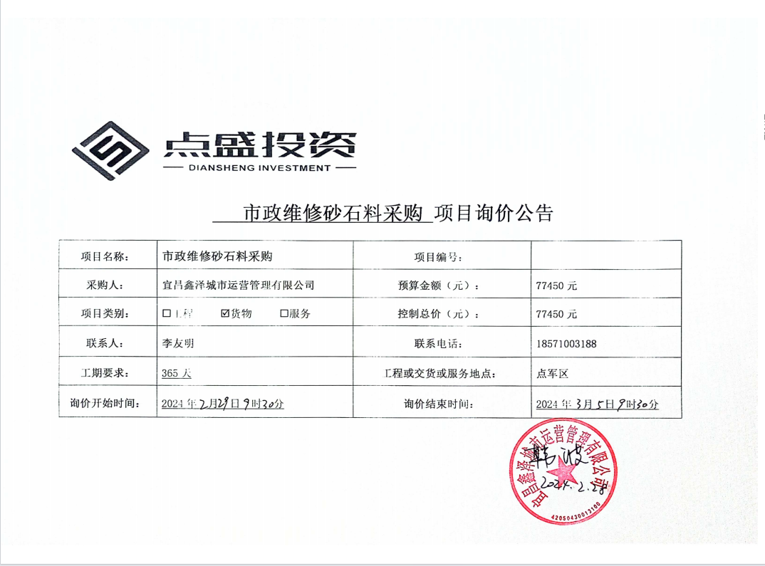 宜昌鑫澤城市運營管理有限公司市政維修砂石料采購項目詢價公告