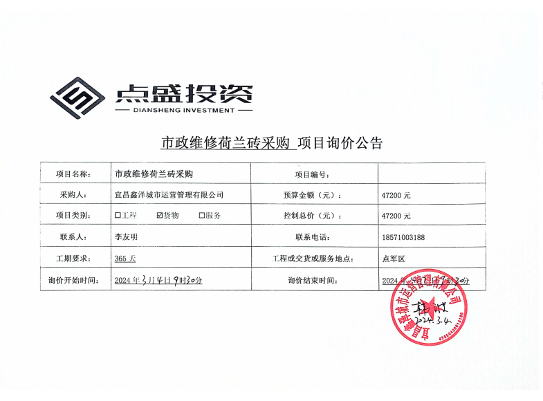 宜昌鑫澤城市運營管理有限公司市政維修荷蘭磚采購項目詢價公告