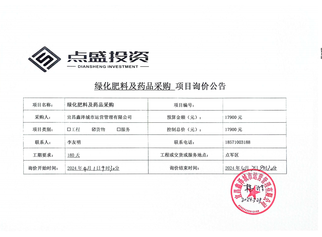 宜昌鑫澤城市運營管理有限公司綠化肥料及藥品采購項目詢價公告
