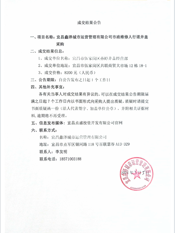 宜昌鑫澤城市運(yùn)營(yíng)管理有限公司市政維修人行道井蓋采購(gòu)項(xiàng)目成交公告