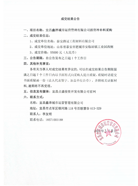 宜昌鑫澤城市運(yùn)營(yíng)管理有限公司瀝青冷補(bǔ)料采購(gòu)項(xiàng)目成交公告