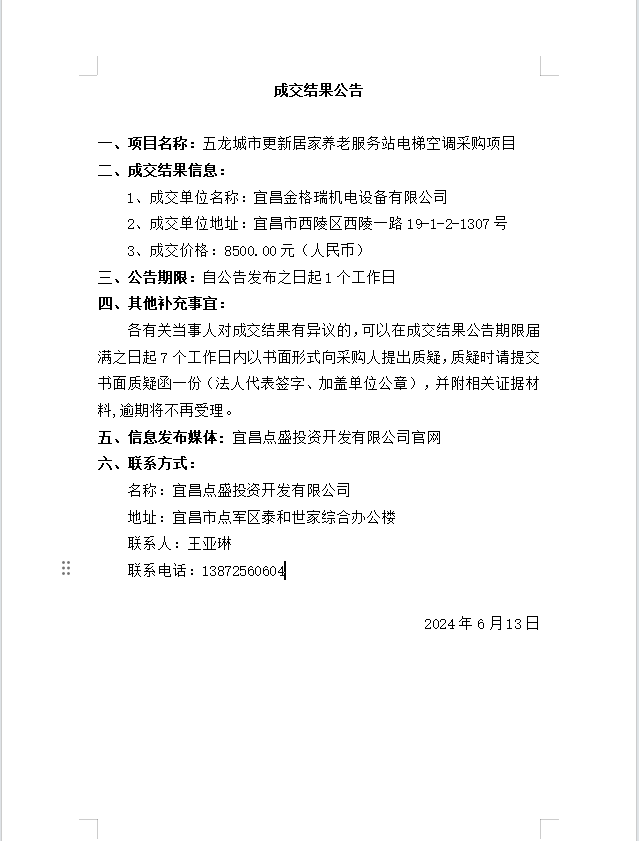 五龍城市更新居家養(yǎng)老服務站電梯空調(diào)采購項目成交公告