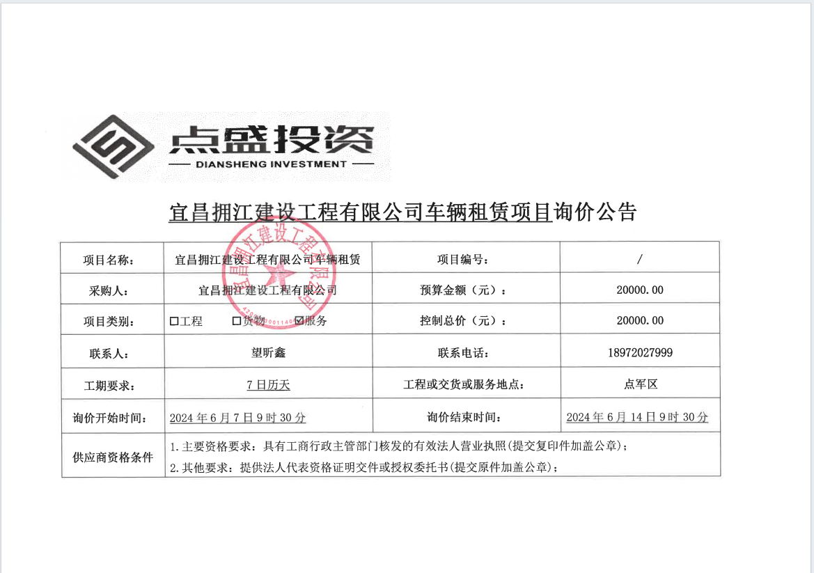 宜昌擁江建設工程有限公司車輛租賃項目詢價公告