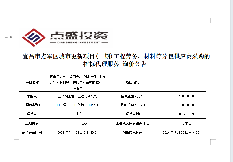 宜昌市點軍區(qū)城市更新項目(一期)工程勞務(wù)、材料等分包供應(yīng)商采購的招標代理服務(wù)詢價公告