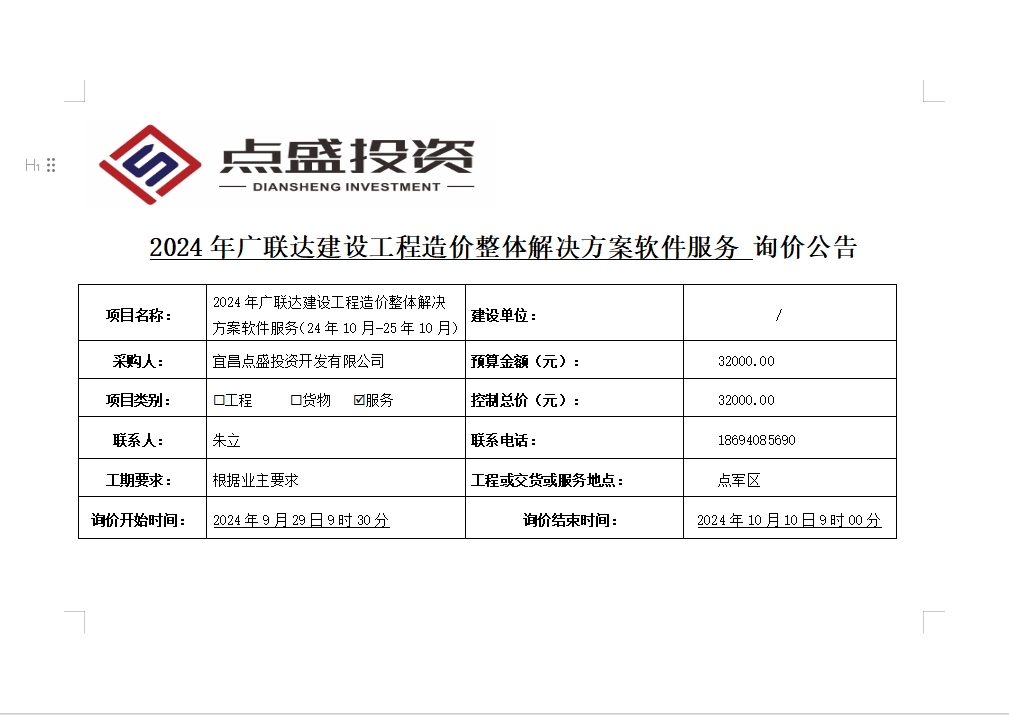 2024年廣聯(lián)達建設工程造價整體解決方案軟件服務詢價公告
