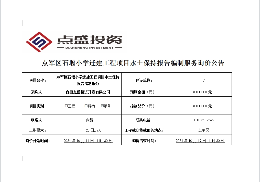 點軍區(qū)石堰小學遷建工程項目水土保持報告編制服務詢價公告