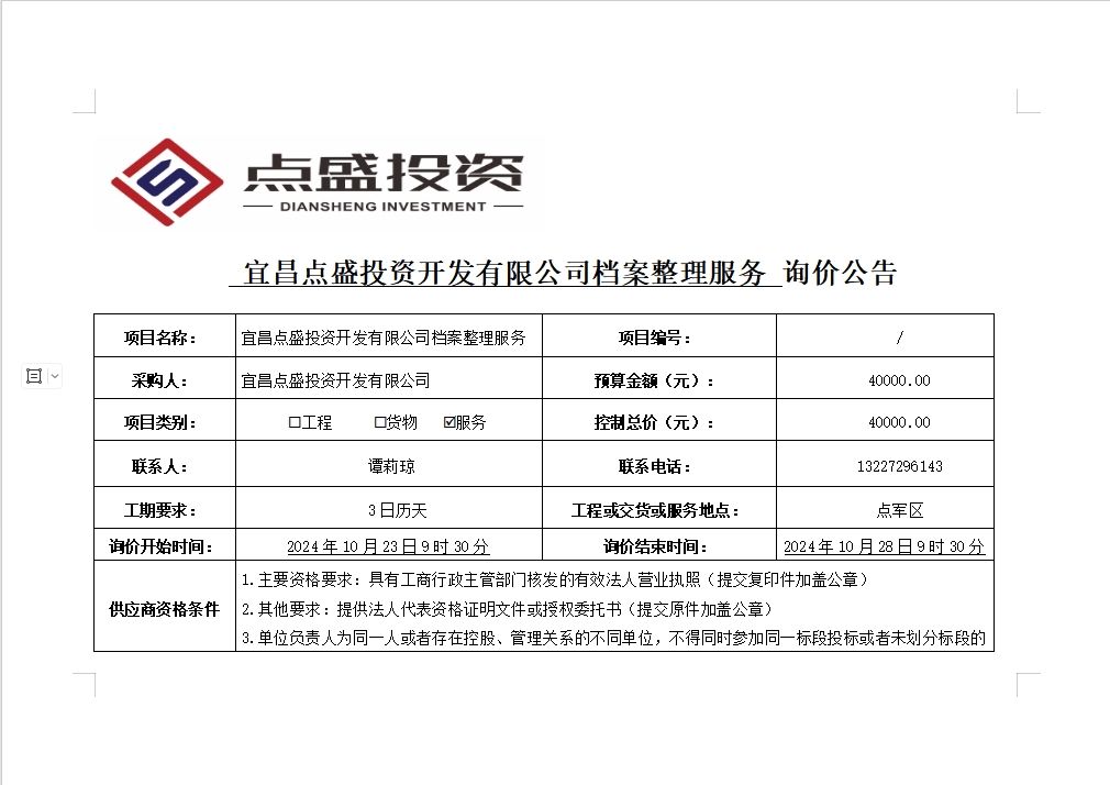 宜昌點(diǎn)盛投資開發(fā)有限公司檔案整理服務(wù)詢價公告