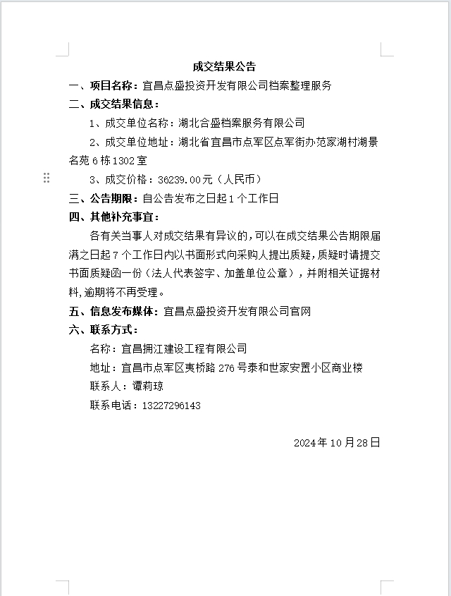 宜昌點(diǎn)盛投資開(kāi)發(fā)有限公司檔案整理服務(wù)成交公告
