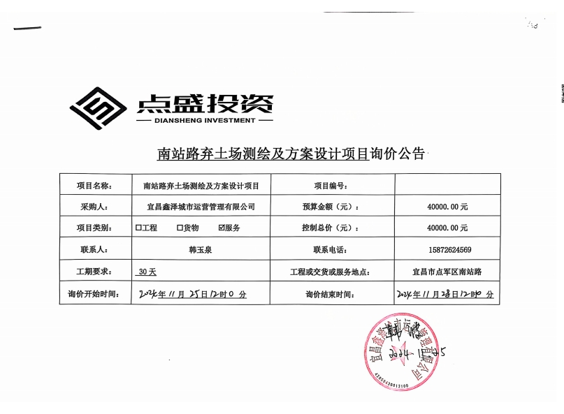 南站路棄土場測繪及方案設(shè)計(jì)項(xiàng)目詢價(jià)公告