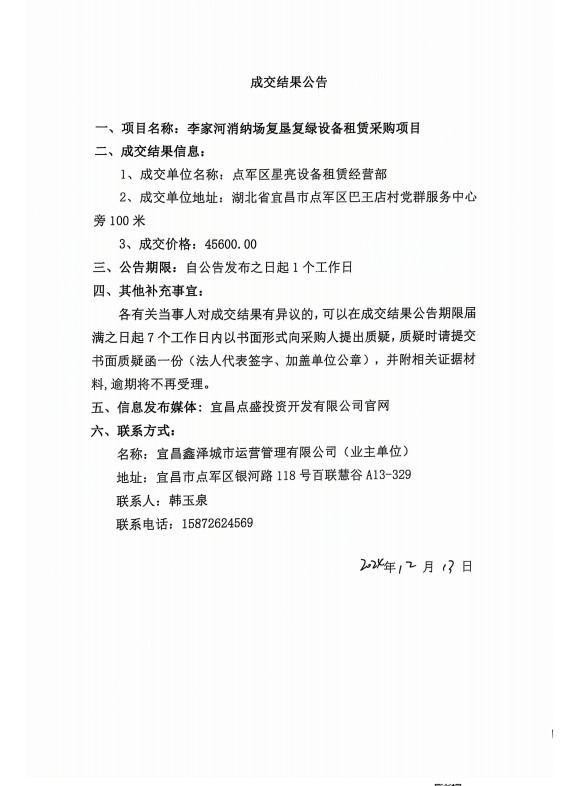李家河銷鈉場復(fù)墾復(fù)綠設(shè)備租賃采購項目成交公告